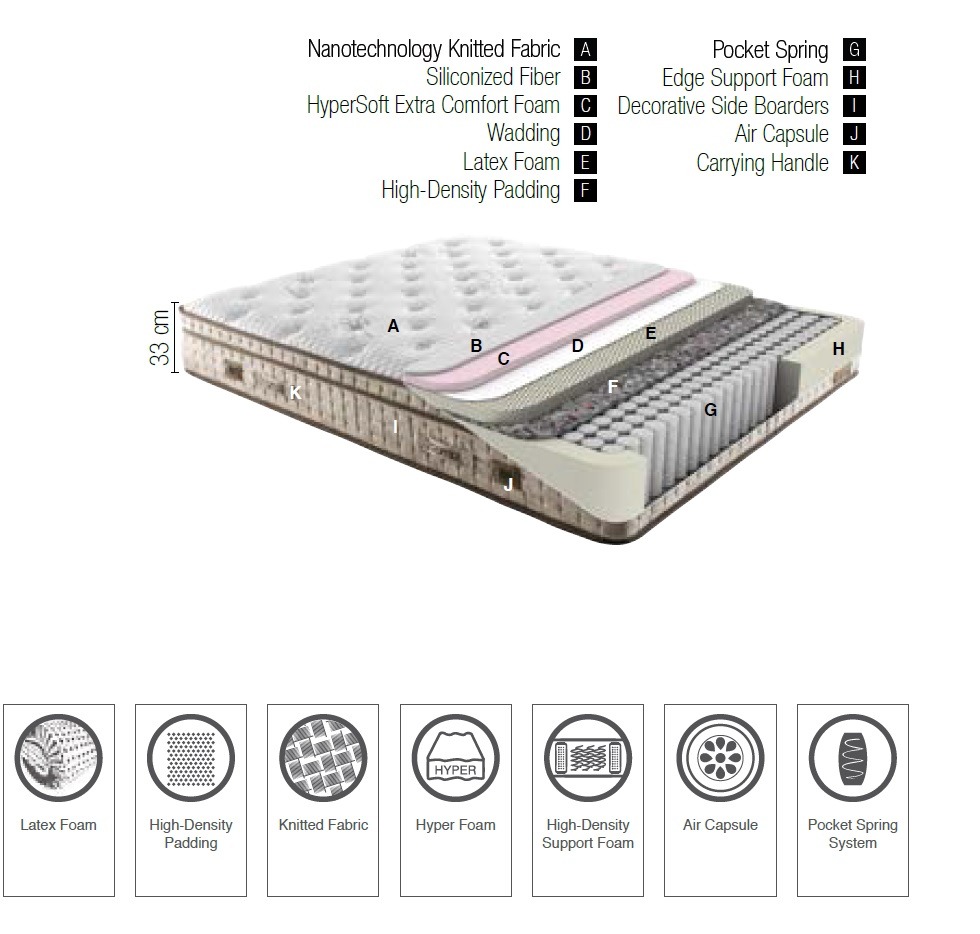 L’éponge HyperSoft est un type d’éponge spéciale qui est plus doux et qui a une flexibilité plus élevée que l’éponge en plumes. Il aide à prendre facilement la forme du corps. L’éponge HyperSoft utilisée pour le matelassage vise à apporter un contact doux et un toucher velouté à votre peau.
